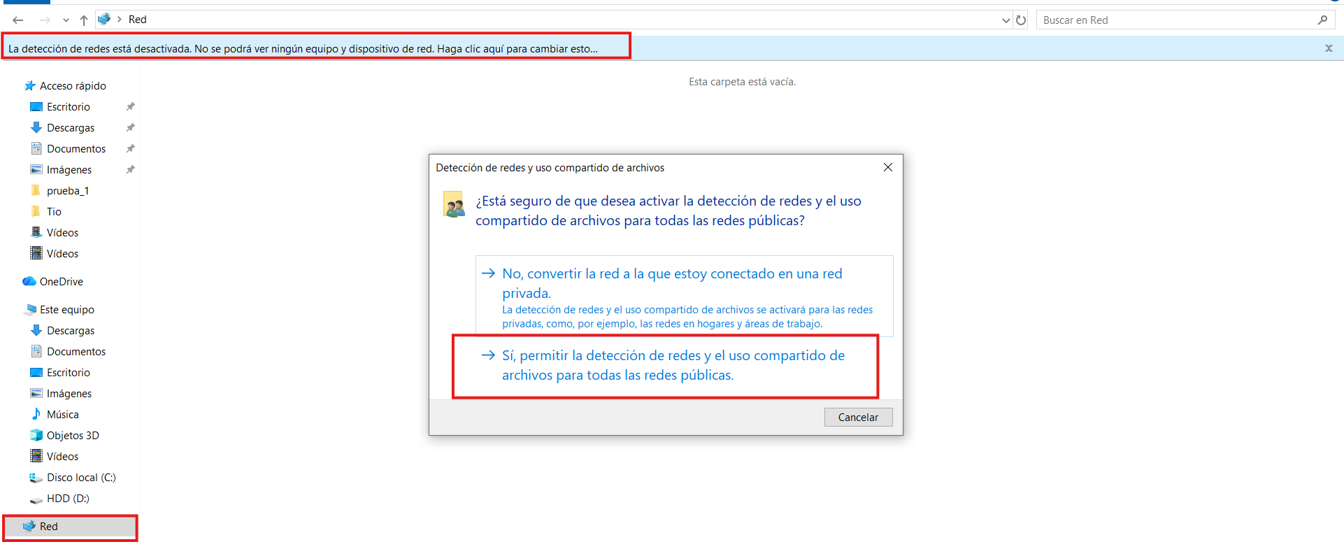 Puede que tengamos que habilitar el descubrimiento de redes.