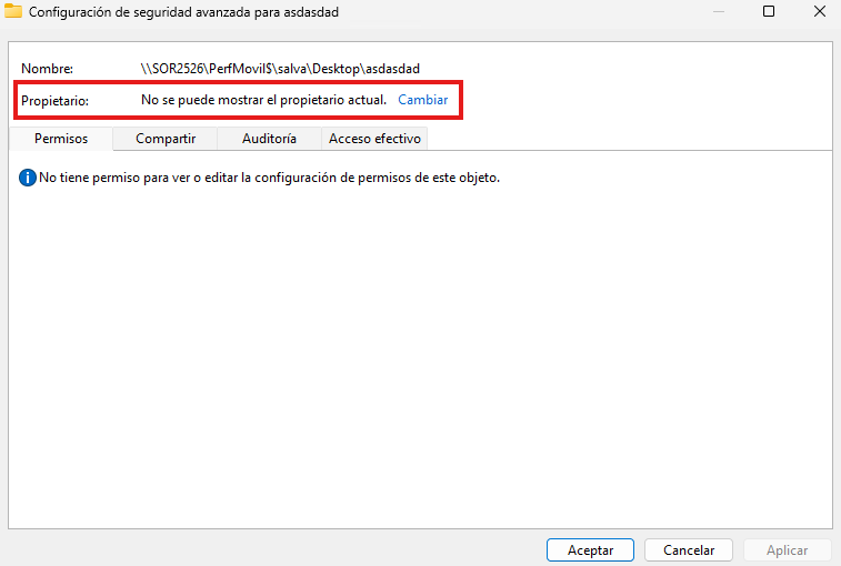 Para poder acceder a la carpeta de un tercero siendo administrador deberemos cambiar los permisos de dicha carpeta.
